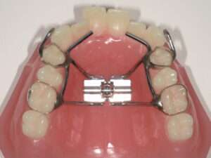 スタッフAの場合は、まず上の写真にある「拡大床」という装置を使って歯が並ぶスペースを作るところから始まりました。